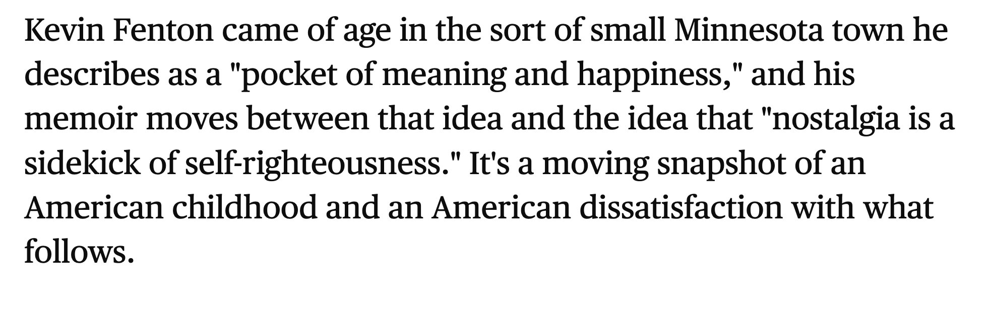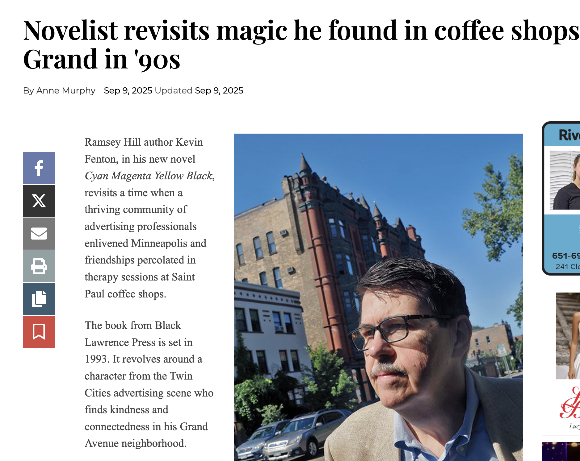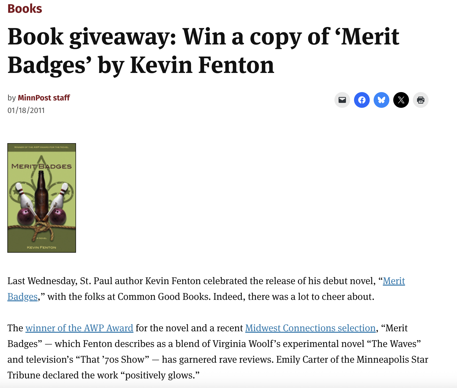 ““By turns funny, compassionate, sarcastic and profound, Cyan Magenta Yellow Black is properly aligned. It joins Fenton’s first novel, Merit Badges, and his memoir, Leaving Rollingstone — both set in 20th-century, rural Minnesota — to add fresh color tones to his growing body of work.” ”